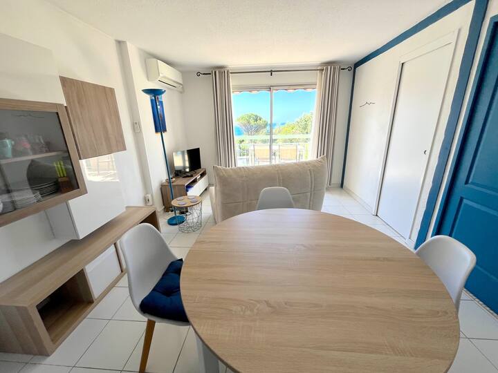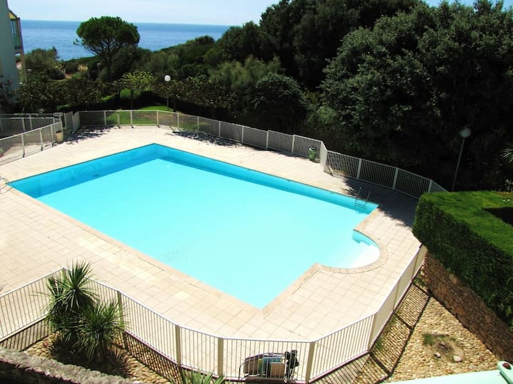 T3 nzuri yenye vyumba 2 vya kulala, bwawa na mwonekano wa bahari
