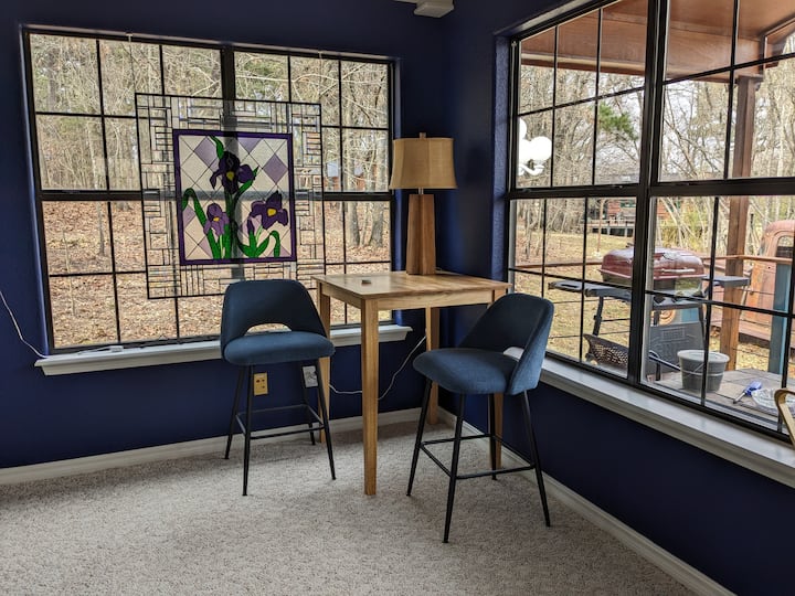 Sisi sote ni wa asili ya Colorado. Jan alimpata Eureka Springs miongo kadhaa iliyopita na kufanya hii kuwa nyumba yake ya kudumu. Dede alihamia hapa baada ya kugundua kambi ya kifahari huko California na , sasa, akiileta Arkansas. Tunashiriki mlima huu na mbwa 2, mbuzi 8, paka 2. ..pamoja na kulungu wengi, mbweha, sungura, na ndege wa twita.