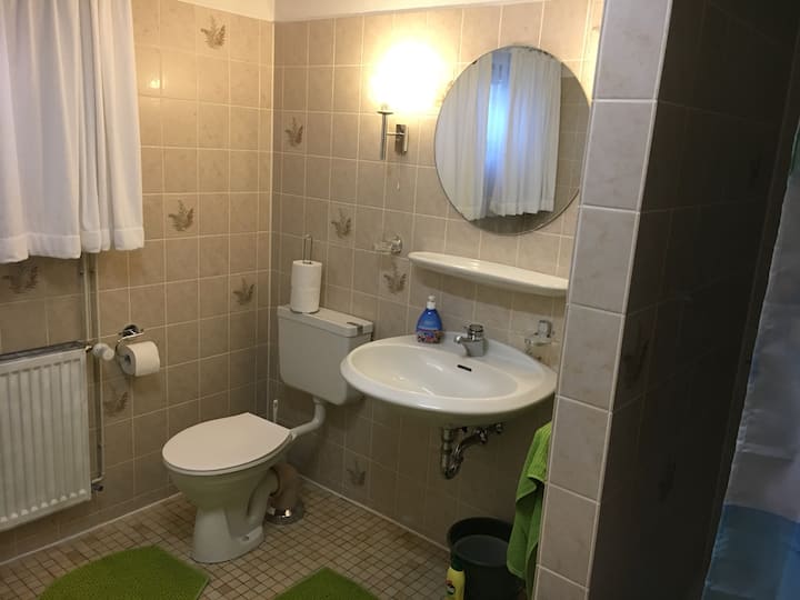 Katika nyumba yangu, unaweza kutarajia eneo la kujitegemea kwenye chumba cha chini chenye chumba kilichotengenezwa vizuri chenye televisheni ya setilaiti, Wi-Fi na kitanda kipana. Katika majira ya joto ni baridi sana. Pia una bafu lako lenye choo, sinki na bafu. Taulo safi zinatolewa.