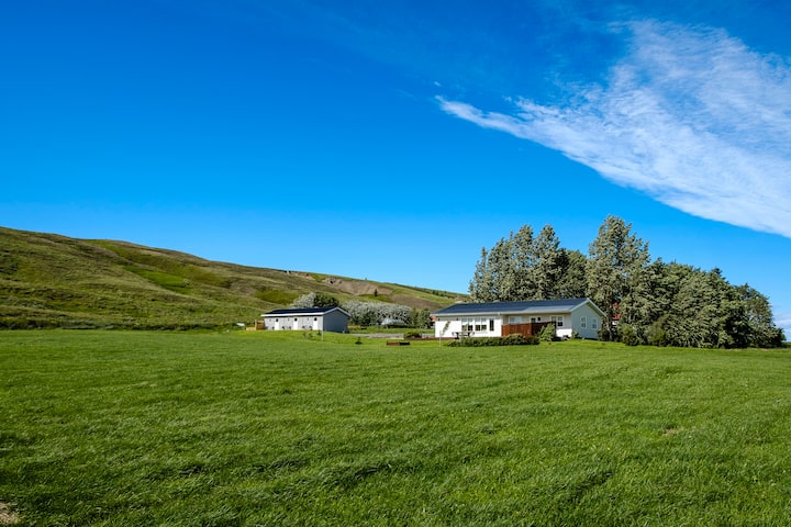 Katika shamba letu tunalima mboga na tunaendesha nyumba ndogo ya wageni kwenye ardhi yetu. Msimu wa mboga nchini Iceland ni mfupi, tunavuna kuanzia Julai hadi majira ya baridi yanapofika. Tuna baadhi ya wanyama shambani, kondoo, kuku na pia Askur, mbwa.