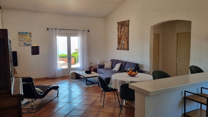 Gundua vila yetu huko Sainte Maxime, iliyo katikati ya bahari na vilima vya kijani kibichi. Hatua chache tu kutoka Les Éléphants na fukwe za La Nartelle, furahia mandhari nzuri ya bahari kutoka kwenye mtaro wetu wenye nafasi kubwa, unaofaa kwa ajili ya chakula cha nje. Sehemu ya ndani inachanganya starehe ya kisasa na uzuri, ikiwa na sebule yenye starehe, jiko lenye vifaa kamili na vyumba viwili vya kulala vyenye airco (tangu mwaka 2025). Furahia bwawa la kujitegemea, linalotoa utulivu na kuogelea chini ya jua la azure.