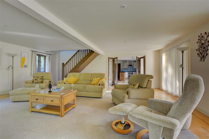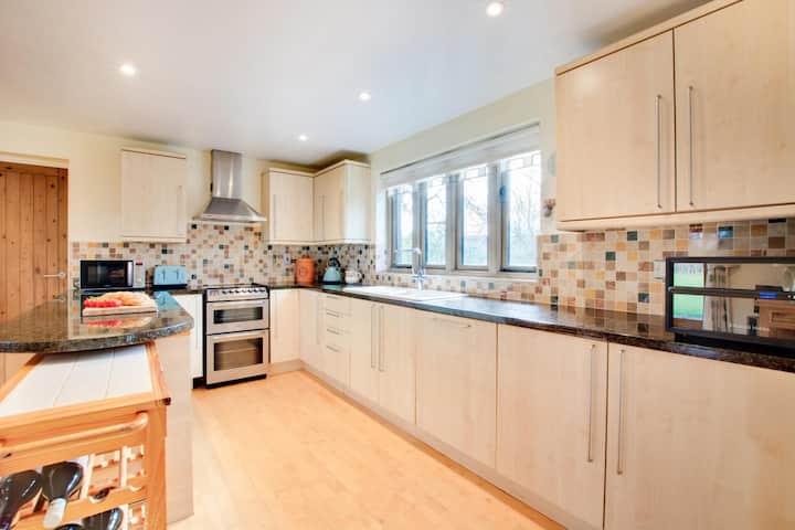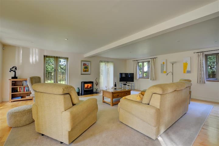 Baada ya jasura ya siku ndefu, vidole vya miguu vyenye baridi na paa kando ya moto wa gesi ya moto katika chumba cha mapumziko kinachoelekea kusini kabla ya kuondoa misuli ya kutembea iliyochoka kwenye sofa za starehe. Jioni inapoingia, nenda kwenye jiko la kisasa/mlo wa jioni ili uwe mbunifu na mazao ya eneo lako na ufanye kumbukumbu maalumu za familia zilizoketi kwenye meza ya chakula. Wakati huwezi kupinga mwito wa kulala, nenda kwenye ghorofa ya juu ili ufurahie kuzama kwenye bafu katika bafu la familia kabla ya kustaafu kwenye chumba chochote kati ya vyumba vitatu vya kulala vilivyoonyeshwa vizuri, vyenye mwanga na angavu ambavyo vina dari za mteremko na madirisha ya Velux. Furahia mandhari ya amani ya marafiki wenye miguu minne wanaochunguza nyasi zilizofungwa na watoto wanaocheza kwenye swing ya mtoto unapokula alfresco kwenye veranda iliyofunikwa na marshmallows kwenye BBQ.