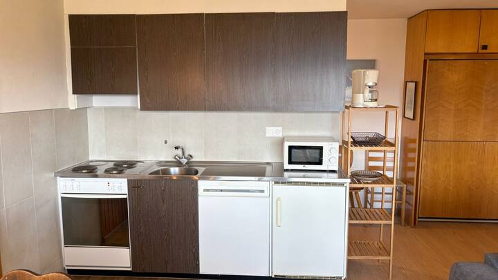 Starehe 2* fleti ya 40 m2 kwenye ghorofa ya chini. Sebule angavu yenye televisheni na kitanda cha ghorofa cha watu 2. Jiko lililo wazi lenye sehemu ya friji/friji, oveni, mashine ya kuchuja kahawa, mashine ya kuosha vyombo, kibaniko, microwave.
