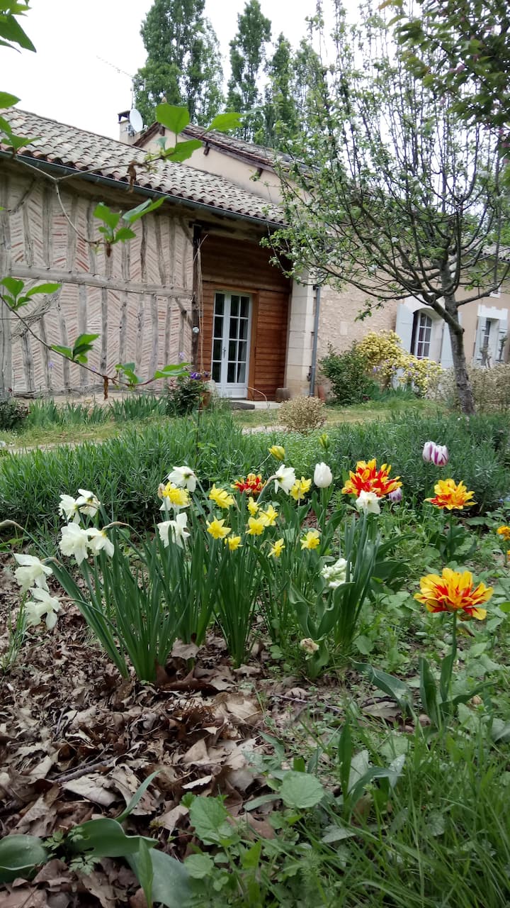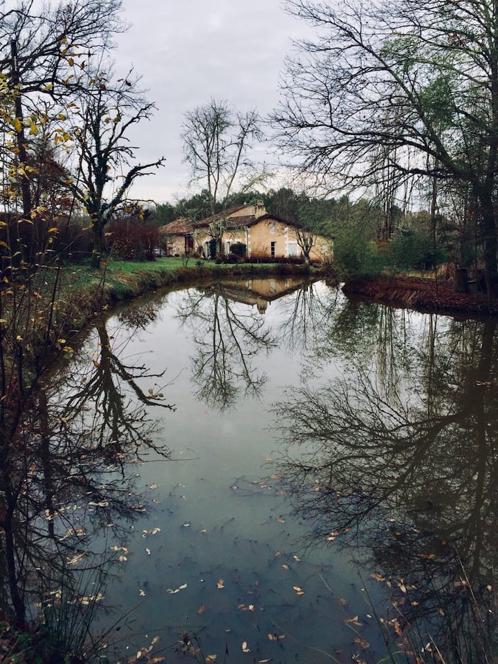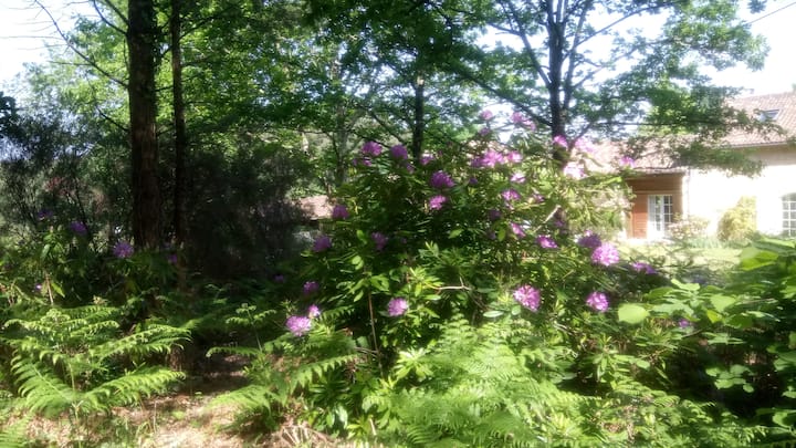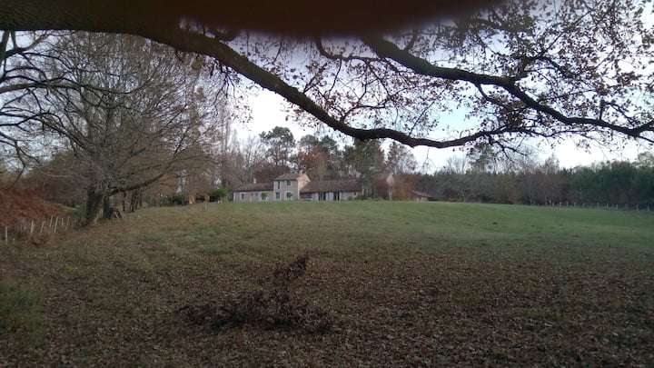 Chumba cha kulala na ukaaji wa wageni (pamoja na piano kwa ajili ya wanamuziki wanaowezekana) katika nyumba ya Perigord katika msitu wa Double. Starehe katika mazingira yaliyohifadhiwa. Inaruhusu hadi watu 5 (vitanda 2 vya watu wawili na kitanda kimoja).