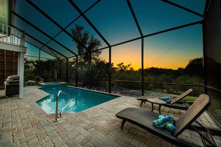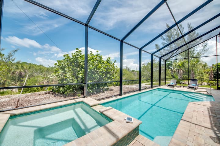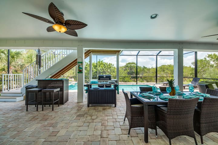 Nyumba hii yenye vyumba 3 vya kulala, bafu 3 ina mvuto wa Key West na mandhari ya Mto Sanibel. Bwawa lenye joto, la kujitegemea, la maji ya chumvi na spa hupokea jua la alasiri.