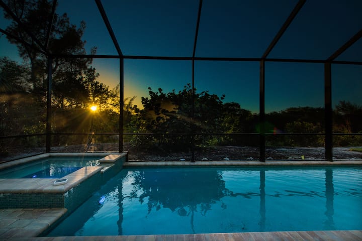 Kukiwa na mvuto wa ajabu wa Key West na mandhari maridadi ya Mto Sanibel, nyumba hii yenye vyumba 3 vya kulala, bafu 3 ni matembezi mafupi tu kuelekea kwenye ufikiaji wa ufukwe uliotengwa. Vifaa vyote vya ufukweni vinatolewa, na baada ya dakika chache utakuwa ukipumzika kwenye mchanga mweupe, ukikusanya mifereji ya bahari uipendayo, uvuvi kutoka ufukweni, kutazama pomboo zikicheza, au kuzama kwenye Ghuba ya Meksiko. Asubuhi huleta mawio mazuri ya kisiwa, na jioni ni kubwa kutokana na machweo yenye rangi nyekundu. Kupokea jua la alasiri, bwawa la maji ya chumvi na spa litakufurahisha.