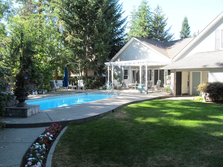 Ua wa nyuma wa nyumba unafikiwa kupitia milango ya Kifaransa ya sebule na ina uzio kamili kwa ajili ya faragha na mandhari nzuri iliyozungukwa na miti ya msonobari. Bwawa la kuogelea la maji ya chumvi lililo ndani ya ardhi lina joto hadi digrii 87 na lina kishikio kutoka mwisho wa kina kirefu na viti vya benchi kwenye bwawa. Pia kuna benchi kwenye mwisho wa kina kwa ajili ya kukaa na kupumzika. Ua wa nyuma una baraza kubwa zenye mwanga na vibanda na chemchemi. Kuna meza na viti vilivyochakaa kwa ajili ya watu 12. Ukumbi wa chini uliofunikwa na arbor huweka kitanda cha malkia chenye ukubwa wa inflatable kwa ajili ya kulala mchana. Pia kuna BBQ iliyo kwenye baraza ya chini. Vitu vingi vya kuchezea vya bwawa, vya kuelea na taulo za ufukweni. (Hakuna beseni la maji moto linalopatikana, kwa wakati huu.)