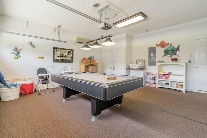 Chumba hiki cha mchezo kilicho na hewa ya kutosha kina meza ya bwawa la ukubwa kamili, meza ya Lego, ukuta uliowekwa kwenye runinga na michezo kadhaa ya ubao.