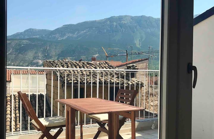 Nyumba ya kale ya mjini iliyo na mwonekano wa mlima