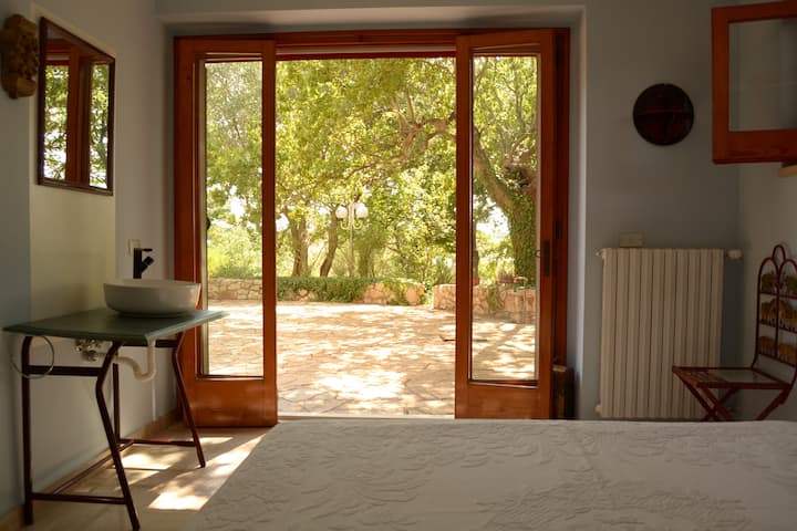 Ghala lenye ufikiaji wa mbele linajumuisha baraza ndogo, ukumbi wa mapumziko wenye nafasi kubwa, vyumba viwili vya kulala kwa ajili ya wageni (Par Tòt - Cumin na Par Tòt - Sesame), chumba chetu cha kulala, mabafu mawili, jiko la kutosha/sebule, na mtaro mdogo wa starehe chini ya kivuli cha mialoni, kwa ajili ya kifungua kinywa kizuri juu ya bonde.