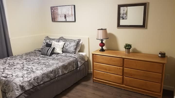Kwa mipangilio ya kulala, kitanda cha malkia, kitanda cha trundle ambacho kinaweza kuwa vitanda viwili au kutumika kama mfalme. Kochi katika sebule pia linakunjwa kwenye chumba cha kulala cha kustarehesha pia! Mito mingi, mablanketi na kila kitu kingine.