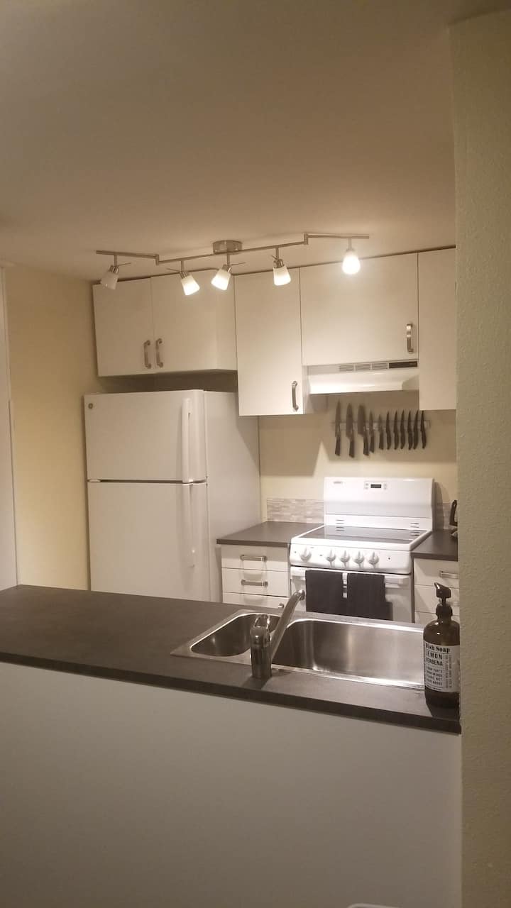 Hivi karibuni ilirekebishwa kondo la vyumba viwili vya kulala. Jiko lililo na vifaa vya kutosha, tayari kwa ajili ya kupata milo mizuri! Mashine ya kuosha katika kifaa na mashine ya kukausha nguo kwenye eneo.
