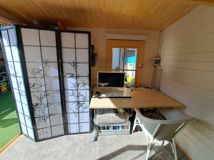 Kulala/kufanya kazi kwenye nyumba ya mbao ya bustani ya kati, ya kujitegemea, yenye utulivu