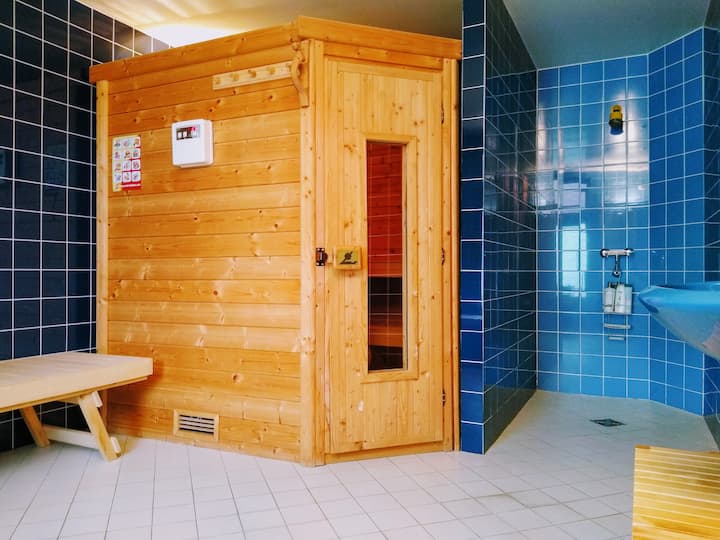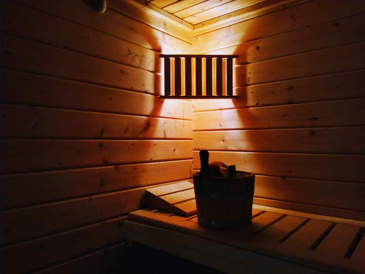 Chumba chenye nafasi kubwa, chenye jua na mafunzo makubwa na sauna