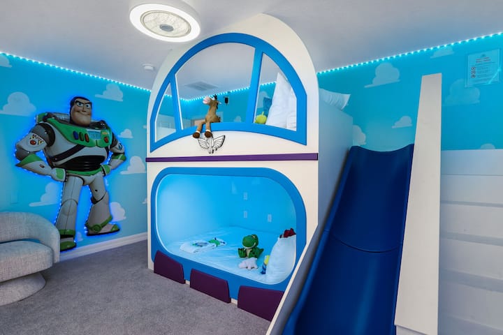 Ghorofa ya juu mbele ya nyumba kuna King Master iliyo na mapambo ya White Green, televisheni mahiri, feni ya dari, kabati na bafu la chumbani. Pia kuna chumba cha kulala cha kifalme cha kifalme kilichotengenezwa na Twin/Twin kilichotengenezwa na televisheni mahiri na Kabati. Chumba hiki cha kulala kinashiriki bafu lenye chumba cha kulala chenye mada ya Superhero ambacho kina vitanda viwili vilivyojaa juu ya ghorofa 2.