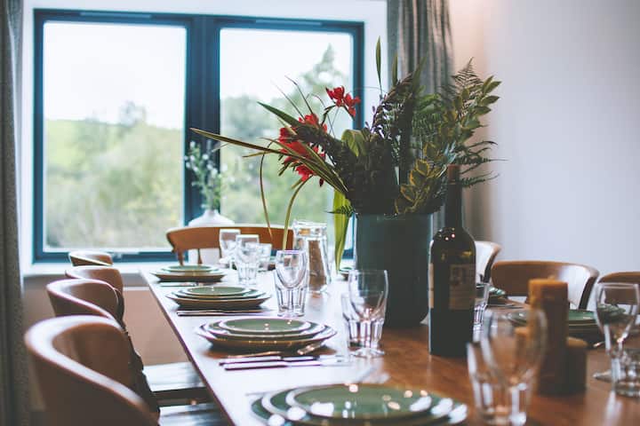 Nyumba ya Mill ina sehemu nzuri ya kula kwa makundi, ikiwa na jiko la hali ya juu, meza kubwa ya mwaloni ya kula ndani na nje ya bustani kubwa iliyofungwa ya uani iliyo na meza nyingine kubwa ya mwaloni ya kula na eneo la sitaha lililofunikwa linaloweza kutumika kwa njia nyingi.