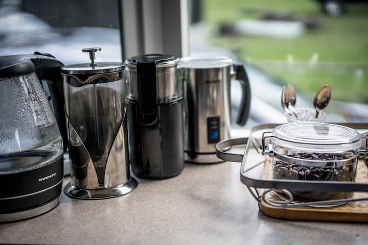 Chumba cha kulia kina meza kubwa ya mviringo iliyo na Susan mvivu katikati na mwonekano wa uwanja wa gofu. Jiko lina hifadhi nyingi kwenye makabati na lina vifaa kamili na yote unayohitaji ili kupika dhoruba. Jisikie huru kufurahia matumizi ya viungo na msimu, kahawa na chai. Kwa wapenzi wengine wa kahawa huko nje, tuna vifaa vyote; maziwa kwa ajili ya lattes yako au kakao ya moto, na sufuria ya kahawa. Na kwa wapenzi wenzetu wa chai tuna majani yaliyolegea na chai yenye mifuko, na sufuria ya chai:). Uko tayari kwa ajili ya uchangamfu!