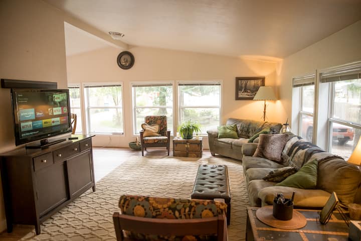 Mapumziko yetu ya milimani yana nafasi ya kutosha kwa ajili ya mkusanyiko mkubwa wa familia, makundi ya marafiki na bado wanahisi starehe vya kutosha kwa safari ya kimapenzi kwa watu 2. Nyumba hiyo inafaa zaidi kwa watu wazima 6-8 na watoto 2-4, kulingana na jinsi mlivyo rafiki;) Inalala hadi watu 10. Sebule yenye nafasi kubwa na angavu ina kochi kubwa, kiti cha upendo na viti kadhaa, na skrini tambarare iliyo na Netflix, Hulu, Disney +, Amazon Prime Video na mkusanyiko wetu mzuri wa DVD, bila kutaja nafasi kubwa ya kuenea na kufurahia mkusanyiko wetu wa kina wa michezo kwa usiku wenye starehe huko.
