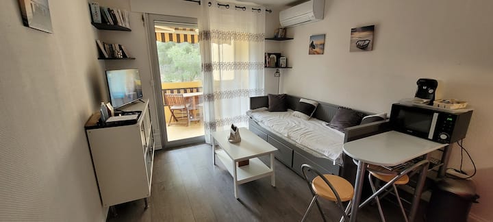 TG* Studio 4 pers katika ufukwe wa Boulouris mita 150 kwa miguu