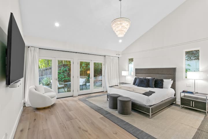 Nje, bwawa na spa zimezungukwa na kijani kibichi, viti vya kupumzikia vya jua na cabana yenye kivuli iliyo na viti laini na mwangaza wa mazingira. Kila kipengele cha nyumba kimebuniwa ili kutoa starehe, faragha na uzoefu ulioboreshwa katika mojawapo ya vitongoji maarufu zaidi vya Los Angeles.