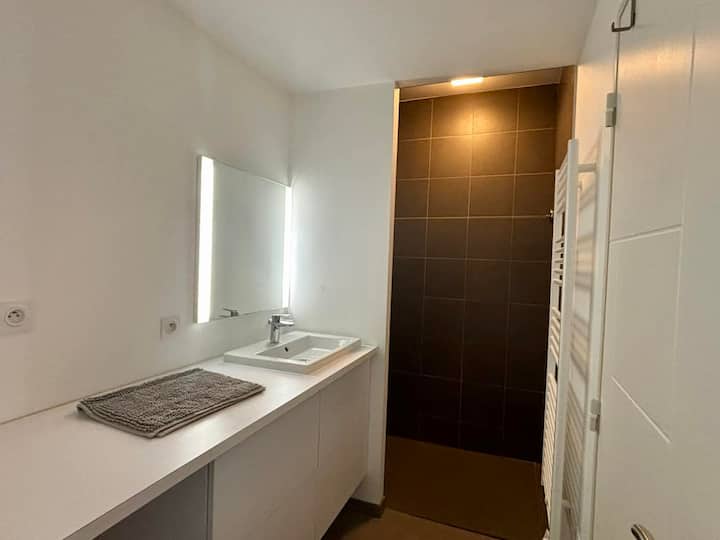 Bafu lenye bafu la kuingia, kabati la kuogea na kipasha-joto cha taulo,