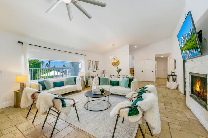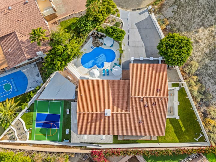 Nyumba imekarabatiwa hivi karibuni na kupambwa upya kwa kuzingatia mikwaruzo ya jangwani. Sehemu hiyo ni angavu na inavutia ikiwa na hisia ya kupumzika. Unaweza kufanya yoga (mikeka inatolewa) kwenye moja ya roshani au kwenye ua wa mbele au wakati huo huo ufurahie kucheza michezo na mipira, rackets na yote ambayo ungehitaji kutolewa. Mchezo wa michezo umekamilika na friji ya baa, michezo ya ubao, meza ya bwawa na meza ya mpira wa magongo, kochi ni kitanda cha sofa cha malkia ambapo unaweza kujinyoosha na kupumzika huku ukitazama sinema au michezo (televisheni mahiri, Netflix, televisheni ya Apple na kebo). Iko kwenye usawa wake na mabafu 2 ambapo wazazi wanaweza kuwa na watoto kufurahia bila kuwa na wasiwasi wa kutoroka mahali popote kwani kuna njia moja tu ya kuingia kwenye chumba cha michezo, ili kutoka nje watalazimika kupanda ngazi katika maeneo makuu ya kuishi ambapo watu wazima wanaweza kupumzika au kukusanyika wenyewe. Pia ni nyumba nzuri kwa makundi, yenye viwango 3 vya nyumba. Wale wanaotaka faragha na utulivu wanaweza kuchagua ghorofa ya juu, ambayo hufungwa kutoka kwenye maeneo makuu, ambapo vyumba 4 vinavyofuata viko na ghorofa ya chini ya chumba cha michezo vina mlango na kisha, chumba cha michezo chenyewe. Kwa hivyo inaweza kuwa kinga kabisa, ikiwa watu wanataka kukusanyika na kukaa, wakati wengine wanataka kupata kodi yao labda kwa ajili ya gofu ya asubuhi au shughuli nyingine za asubuhi au hata kufanya kazi fulani.