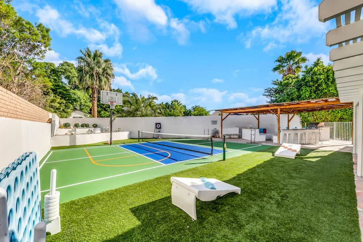 Njoo ufurahie nyumba yetu nzuri na yenye nafasi kubwa sana yenye mandhari mazuri na burudani nyingi. Imekarabatiwa na kupambwa upya. Iwe unataka lango la kupumzika au lililojaa furaha, tumeshughulikia hilo. Kuanzia bwawa la kujitegemea lililo safi kabisa, hadi uwanja wako wa mpira wa kikapu, hadi uwanja wa pickleball na vifaa vya mpira wa wavu na nyavu zinazotolewa, hadi mikeka ya yoga, mpira wa vinyoya, chumba cha michezo na mengi zaidi. Tuko hapa kukusaidia kuunda likizo unayotamani.