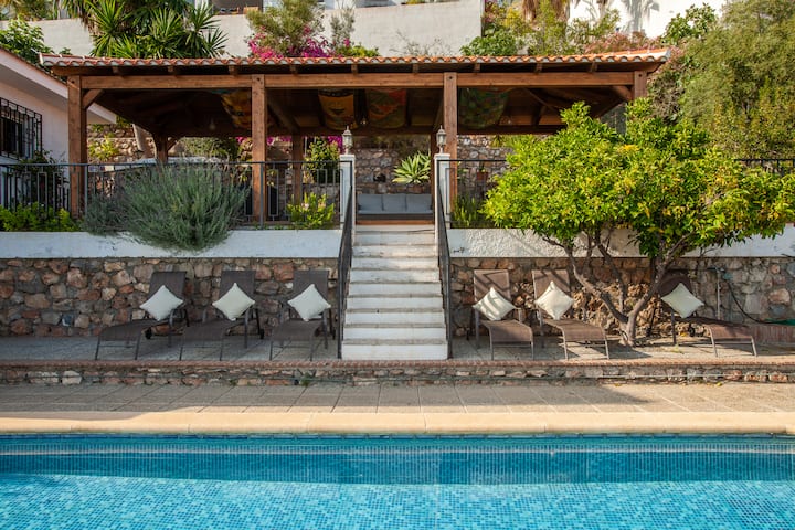 Vila iliyotengwa, yenye utulivu na ya kibinafsi hutoa A/C na WiFi na matuta ya kutosha ya kula, kuota jua, kuoga na kupumzika, pamoja na nafasi ya kushangaza na nzuri ya pergola na matuta mazuri ya bustani yaliyojaa vichaka na maua.