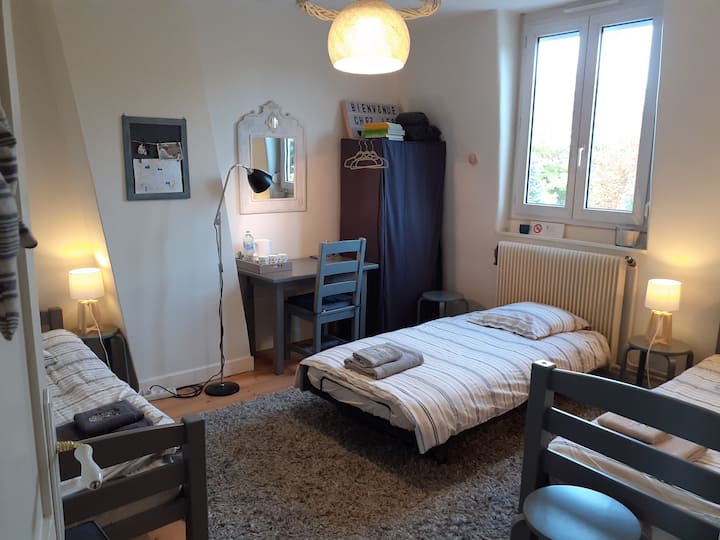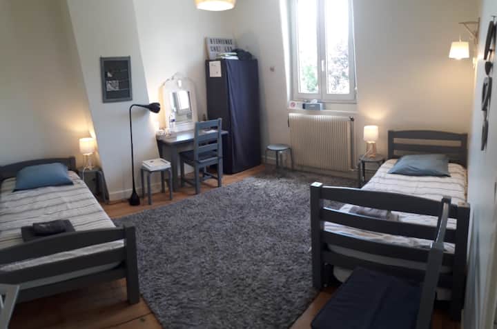 Tuna bahati ya kuwa na nyumba kubwa ya familia ambapo watoto wetu 5 walikulia. Wazee 3 wakiwa wameacha kiota, vyumba vimeachwa na sakafu inapatikana. Ndiyo sababu tunatoa vyumba 2 vya kulala, kimoja kikiwa na kitanda cha watu wawili na kingine kikiwa na vitanda 3 vya mtu mmoja.