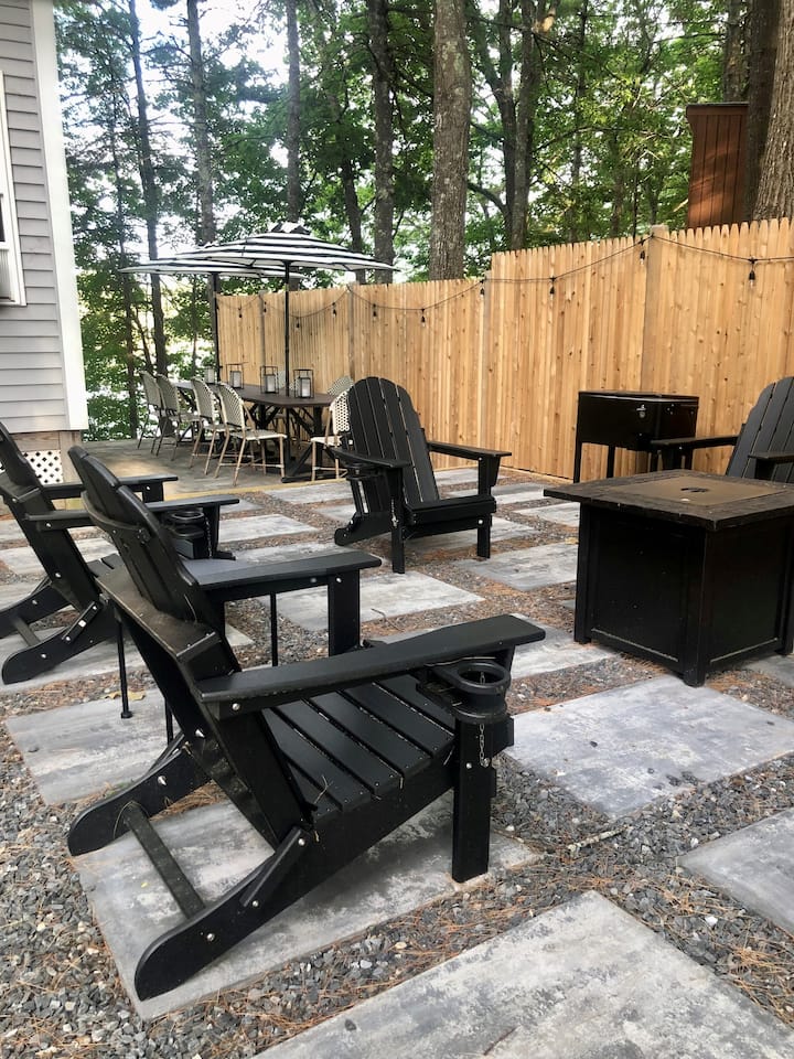 baraza jipya lenye jiko la gesi, jiko la peke yake, mbao, viti vya Adirondack na meza/viti kwa saa nane.