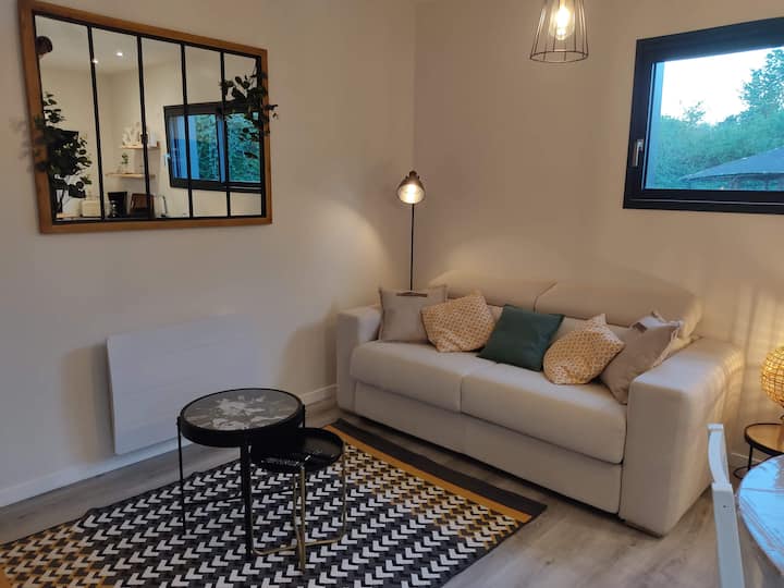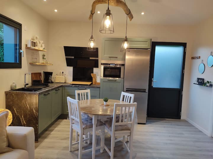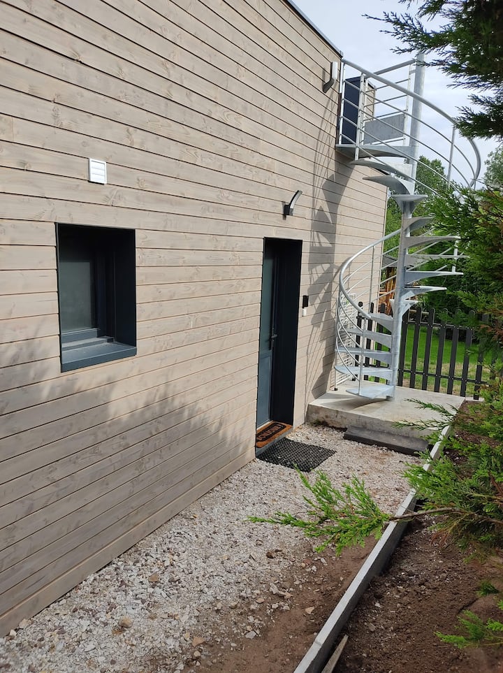 Nyumba ya kupendeza ya mbao, mtaro wa paa, karibu na gofu.