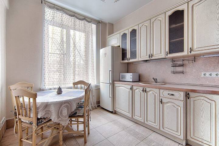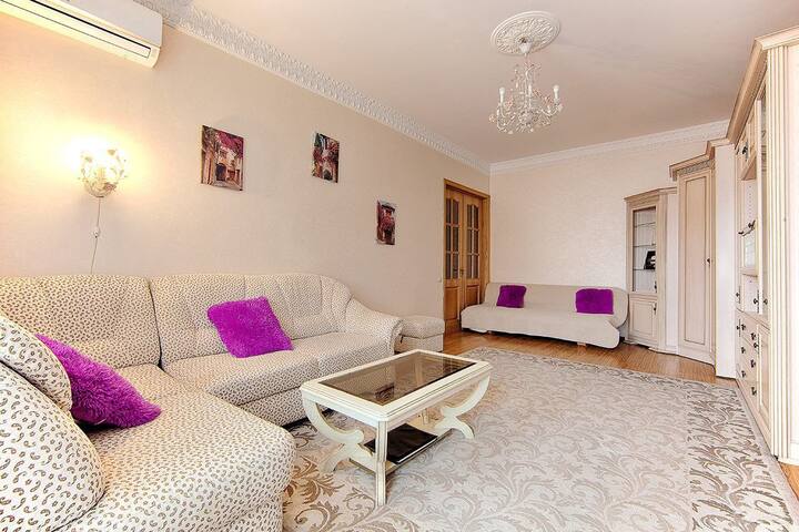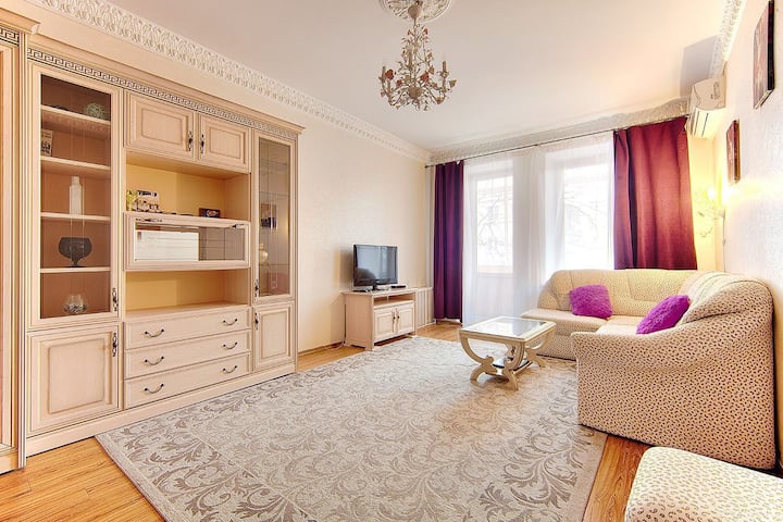 Fleti yenye nafasi kubwa, yenye ukubwa wa mita za mraba 57, yenye nafasi 2+2+2 za kulala, iliyo kwenye ghorofa ya 3 ya jengo la enzi za Stalin lenye ghorofa 8. Inachukua hadi watu 4.