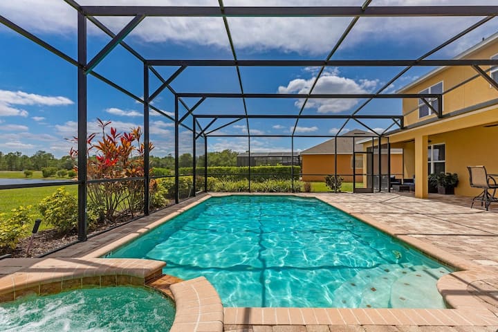 kwenye bustani za mandhari zenye shughuli nyingi. Kutoka kwenye lanai yetu iliyofungwa (baraza) na sitaha ya bwawa, tuna