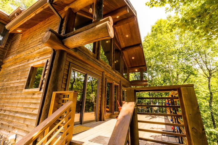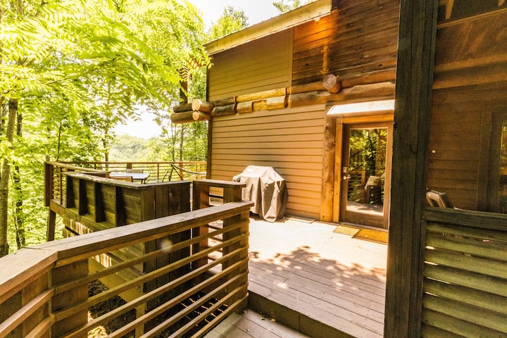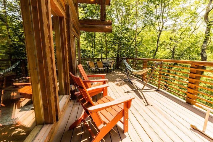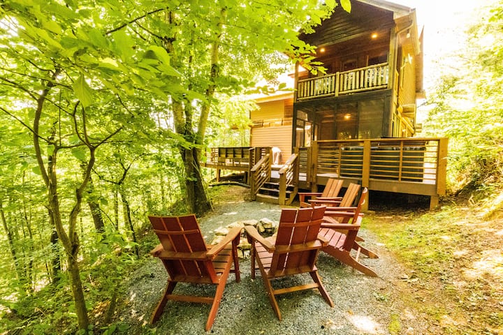 Nyumba yetu ya Mapumziko ina maeneo kadhaa ya nje kwa ajili ya starehe yako. Yard ni kitovu cha mapumziko yetu. Huko, unaweza kupata mwonekano mzuri wa mlima, shimo la moto la kundi, uwanja wa mpira wa bocce, mbao za shimo la mahindi, na logzebo yetu ya saini iliyo na kitanda. Kwa kuongezea, tuna njia ya matembezi kwenye eneo ambalo linaelekea kwenye uwanja wa michezo na Hifadhi yetu ya Eco ambayo ina maporomoko ya maji na daraja mahususi la laurel ya mlima.