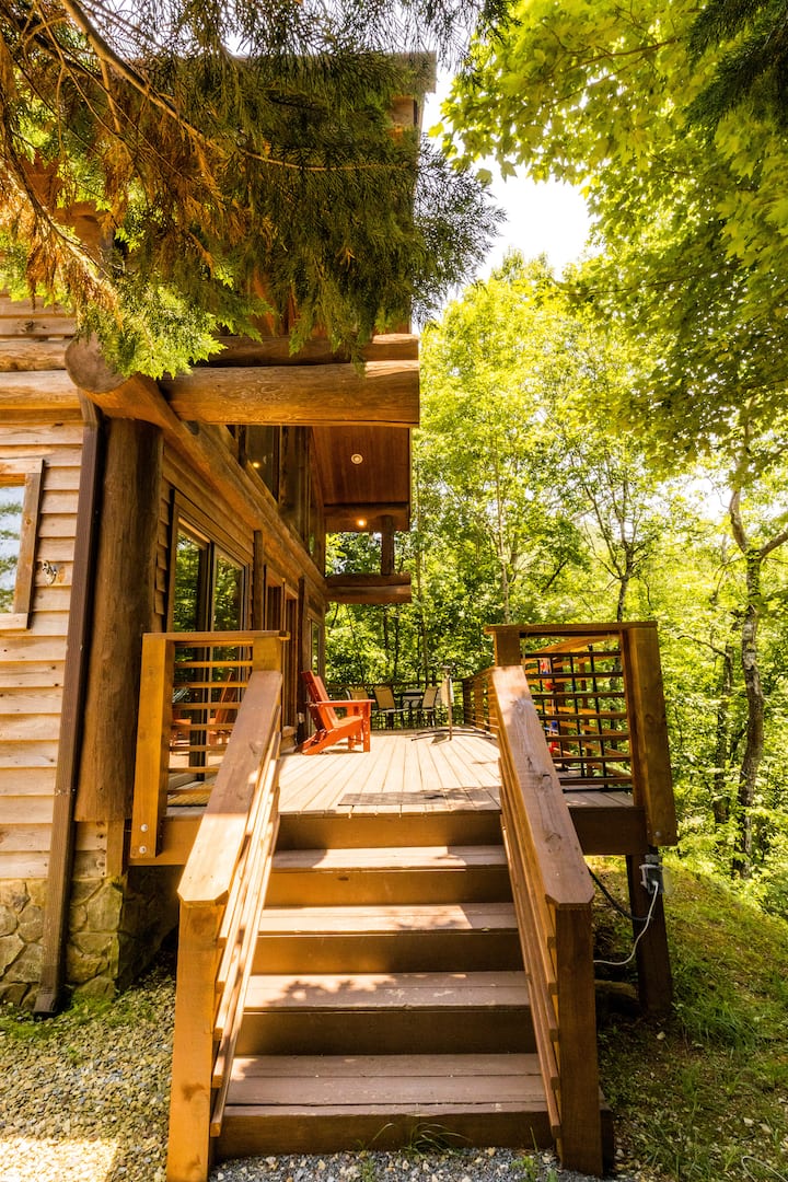 Sehemu kubwa ya kuishi iliyo wazi hutiririka bila usumbufu kuingia jikoni na sehemu ya kulia chakula, na kuifanya iwe kamili kwa ajili ya kupika, kupumzika au kuburudisha. Toka nje hadi kwenye ukumbi uliochunguzwa au sitaha kubwa na upumzike kwenye beseni la maji moto, kukusanyika karibu na kitanda cha moto, au upumzike katika viti vya Adirondack huku ukiangalia mandhari tulivu ya mlima.