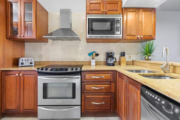 Vila ya Island Time ina jiko rahisi na nadhifu ambalo linafanya kazi ifanyike. Ina friji iliyo na jokofu, oveni ya mikrowevu, oveni, tosta na mashine ya kutengeneza kahawa. Jiko limejengwa kikamilifu na lina vifaa vyote vya chakula cha jioni na vifaa vya kupikia vinavyohitajika kwa ukaaji wa muda mrefu.