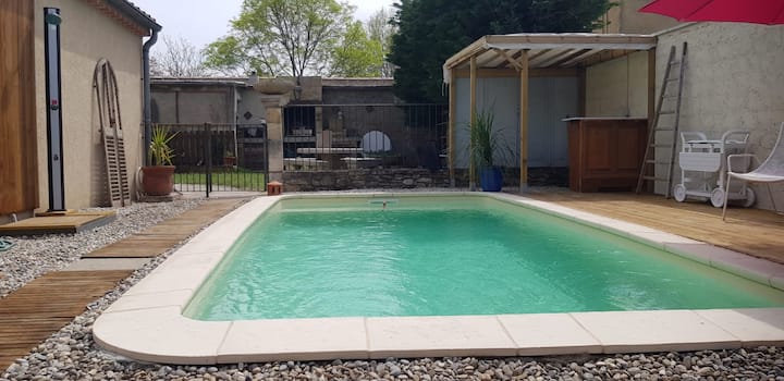 > Bwawa ni salama (6.50/3.50) na limepashwa joto hadi 25* kuanzia Aprili 1 hadi katikati ya Septemba (ikiwa sio hali ya hewa ya baridi, fahamu kwamba hata kama joto la kupasha joto ni 25° ikiwa kuna baridi nje haliwezi kuwa 25°). Imezungukwa na makazi ya bwawa / baa na taa za jioni. Matengenezo hufanywa na mtaalamu wa bwawa la kuogelea.
