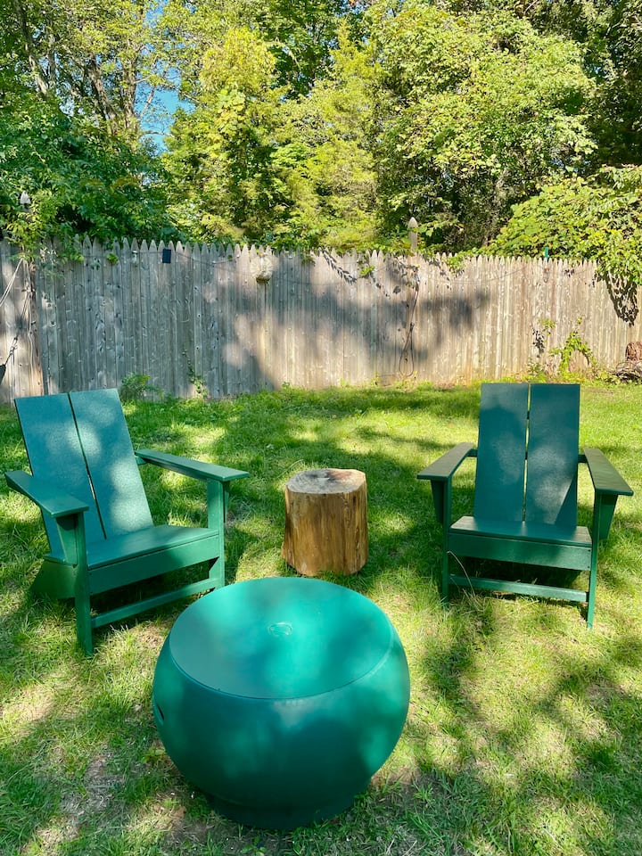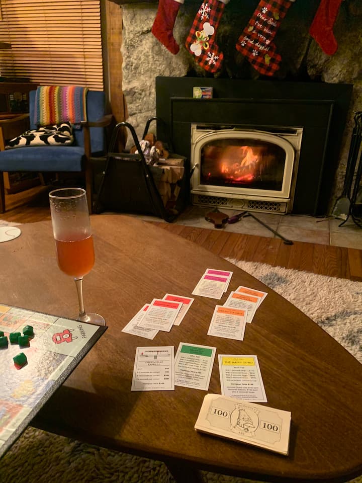 Nenda nje kwenye ua wa nyumba uliozungushiwa uzio kwa ajili ya mbwa, ambapo utapata shimo la moto wa gesi na shimo la moto wa kuni, bora kwa usiku wa baridi chini ya nyota. Sitaha inajumuisha mkaa na jiko la nyama choma la gesi na ndani unaweza kupumzika ukitumia runinga, kifaa cha kucheza muziki, spika ya Bose isiyo na waya na mpangilio wa karaoke kwa usiku wa kupumzika. Bafu kamili lina maji moto na beseni la kuogea, bora kwa ajili ya kupata joto baada ya matembezi ya baridi au matembezi ya ziwani.