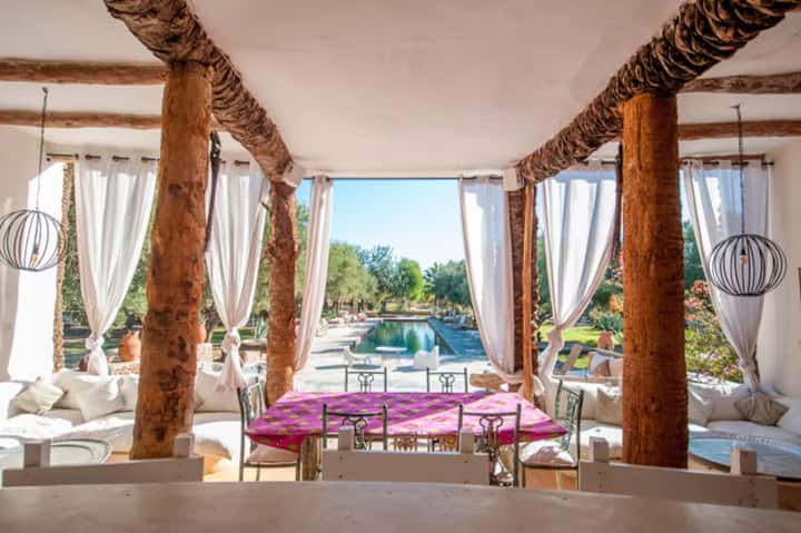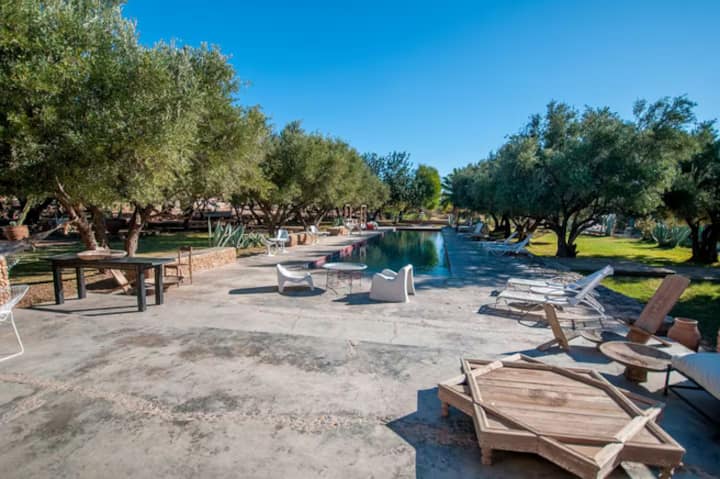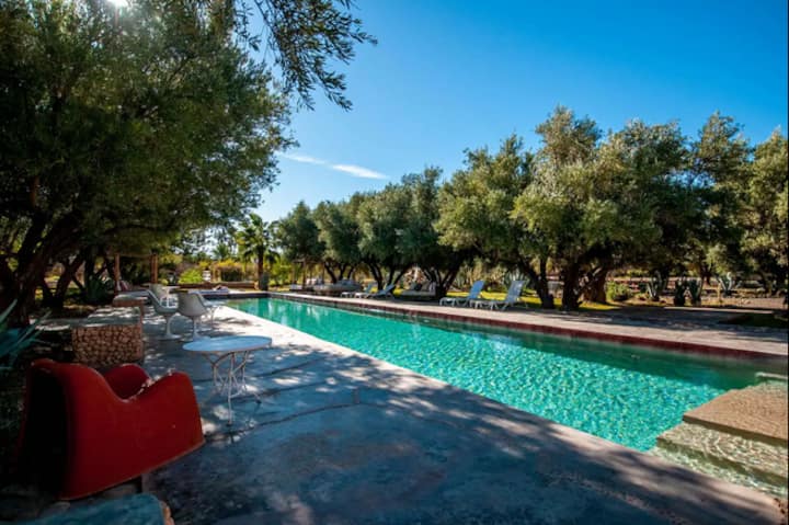 is located in Tamesloht is 25 mn drive from the airport and 35 minutes drive from Marrakech. It can be reached by the road to Amizmiz (on the road to the beautiful Lake of Lalla Takerkoust) or by road that leads to the Desert of Agafay (desert of rocks) Extensive of nearly 3 hectares of olive trees, cacti and other fruit trees, you will find an heaven of tranquility that is sometimes sorely lacking in the Red city, while lounging by of its huge 25m swimming-pool.