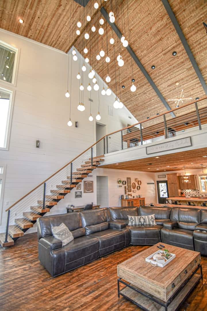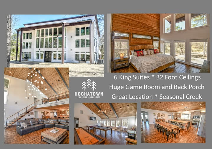 Unapoingia kwenye Chasing rains Lodge utagundua moja ya kipengele maalum cha taa kinachoning 'inia kutoka kwenye dari za vault 32 za miguu, vazi la mkono lisiloweza kuchongwa juu ya mahali pa kuotea moto lililo na upinde wa mvua unaozunguka kuogelea kwenye mkondo, michoro ya mbao iliyo jikoni na eneo la kati la kuishi ambalo hutoa mahali pazuri na pa kuvutia pa kukusanyika kwa wote. Skrini bapa ya inchi 75 ina huduma ya "DirecTV Stream", kichezaji cha Blu-Ray pamoja na kebo iliyoambatishwa kwa kifaa chako binafsi cha mchezo au kifaa kingine. Furahia muziki uupendao ndani na nje ya nyumba ya mbao kwa kuunganisha simu janja kwa mpokeaji wetu wa stereo kupitia muunganisho wa Bluetooth.