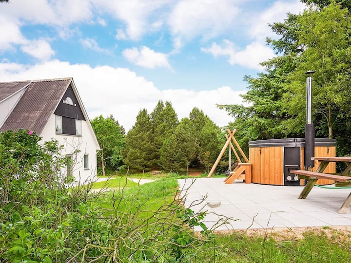Kwenye kiwanja cha asili chenye mwonekano mzuri wa maji huko Helligsø Drag kutoka kwenye nyumba na kwenye kiwanja, utapata nyumba ya shambani & quot; Thybjerg & quot; pamoja na bafu la jangwani. Nyumba ya shambani iko kwenye viwango viwili, imekarabatiwa kabisa mwaka 2020 na inalala watu 21. Kwenye ghorofa ya chini utapata sebule /chumba cha kulia chakula cha pamoja na chumba cha televisheni, vyote vikiwa na ufikiaji wa mtaro mkubwa wa nyumba, ambapo kuna fanicha za bustani na mashimo ya moto yenye jiko la kuchomea nyama. Chumba kikubwa, cha matumizi ya kina kilicho na sinki na nafasi ya ziada ya friza kwa mfano anglers. Kuna bafu kubwa, la jangwa lenye joto kwa watu 6-8, ambalo kuna mtazamo mzuri wa maji. (Kumbuka: DanCenter haitoi huduma juu ya hili). Kuna jiko kubwa, la kitaalamu lililo na mashine ya kuosha vyombo, hob ya kauri na oveni mbili tofauti. Jiko lina chumba tofauti cha kuhifadhia, ambapo kuna nafasi kubwa ya kuhifadhi. Pia kuna friji 2 na friza ya lita 259 inayopatikana. Sebule nzuri yenye runinga janja, Chromecast na usajili wa viasat (njia za viasat tu). Kwenye ghorofa ya chini pia kuna mabafu mawili angavu yenye bomba la mvua na inapokanzwa chini ya sakafu. Kwenye ghorofa ya 1 kuna vyumba vinane vya kulala vyenye vitanda vya mtu mmoja na vitanda viwili pamoja na mabafu mawili, vyote vikiwa na bafu. Nyumba ina chumba cha shughuli ambapo tenisi ya meza na mpira wa meza kwa ukubwa mdogo huwekwa. Wi-Fi imewekwa ndani ya nyumba, ambapo pia inawezekana kutazama televisheni ya Denmark na Ujerumani. Kati ya vifaa vya ziada utapata seti mbili za viti virefu na kofia pamoja na mashine ya kuosha na kukausha. Nyumba ina joto na joto la umeme na pampu ya joto ya hewa / maji. Inawezekana kutoza magari ya umeme kwenye vituo vya kuchaji vya nyumba. Nyumba iko kwenye 23000 m2 kubwa njama ya asili na fursa nyingi za burudani. Miongoni mwa mambo mengine, weka lengo la mkono / mpira wa miguu, shimo kubwa la moto, bafu la jangwa la kupendeza, bafu la nje, sandpit, swings na juu ya nafasi nyingi. Kutoka kwenye nyumba na kwenye kiwanja kuna mwonekano mzuri wa maji na pwani ni umbali mfupi tu kutoka kwenye nyumba. Si kwa ajili ya kukodisha kwa makundi ya vijana.