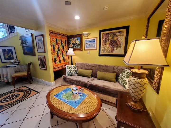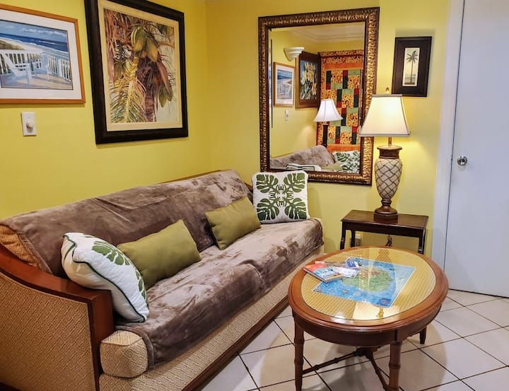 Fleti hii ya roshani ya ghorofa 2 iko katika jengo la zamani la mtindo wa shamba, ambalo limekarabatiwa sana na kusasishwa, lakini bado linakumbusha Hawaii ya Kale. Ina samani na ina vifaa kamili, ina mapambo ya kitropiki na inakaribisha watu wawili kwa starehe. Ikiwa imezungukwa na mimea ya kitropiki na sanamu na vitu, ni sehemu ya jumuiya ndogo na ya kirafiki ya makazi iliyojaa roho ya Aloha. Unaweza kufika, ingia, unpack na upumzike -- au uelekee moja kwa moja ufukweni.
