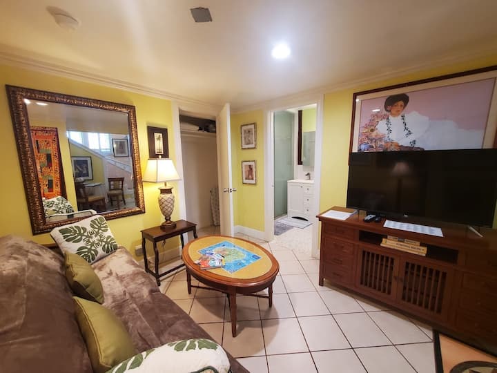 Fleti hii ya ghorofa ya 2 ya roshani iliyo na sanaa na mapambo ya "zamani" iko katika mji wa Kapa'a, kwa urahisi karibu na ufukwe, njia ya baiskeli ya kushangaza, mikahawa mizuri, na maduka ya vyakula - lakini yamefichwa na yamefichwa. Maegesho mengi, matumizi ya bure ya baiskeli na vifaa vya kufulia.