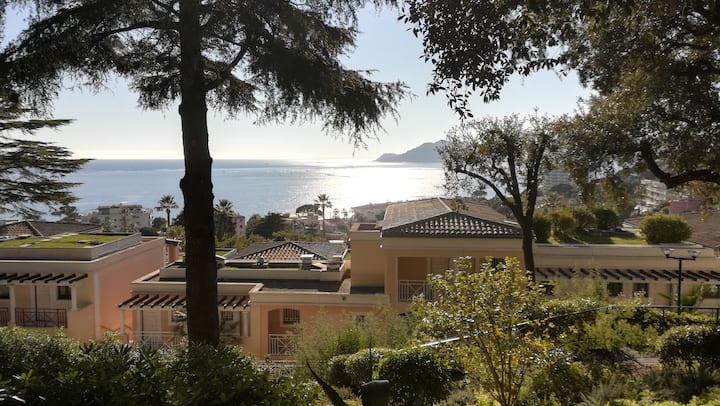 Duplex katika bustani ya kijani, mtazamo mzuri wa bahari