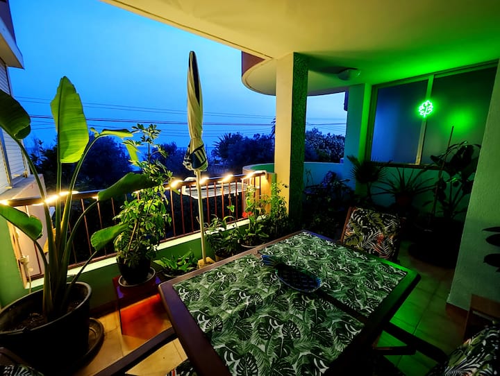 Fleti ya ufukweni iliyo na mtaro na bwawa la kuogelea.