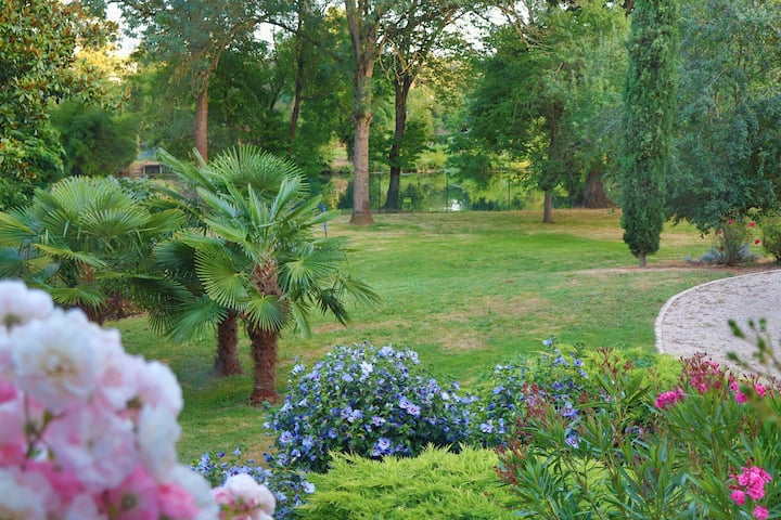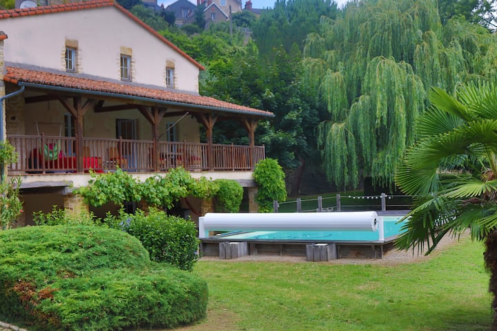 Vila ya kando ya mto yenye bwawa katika mji wa kihistoria