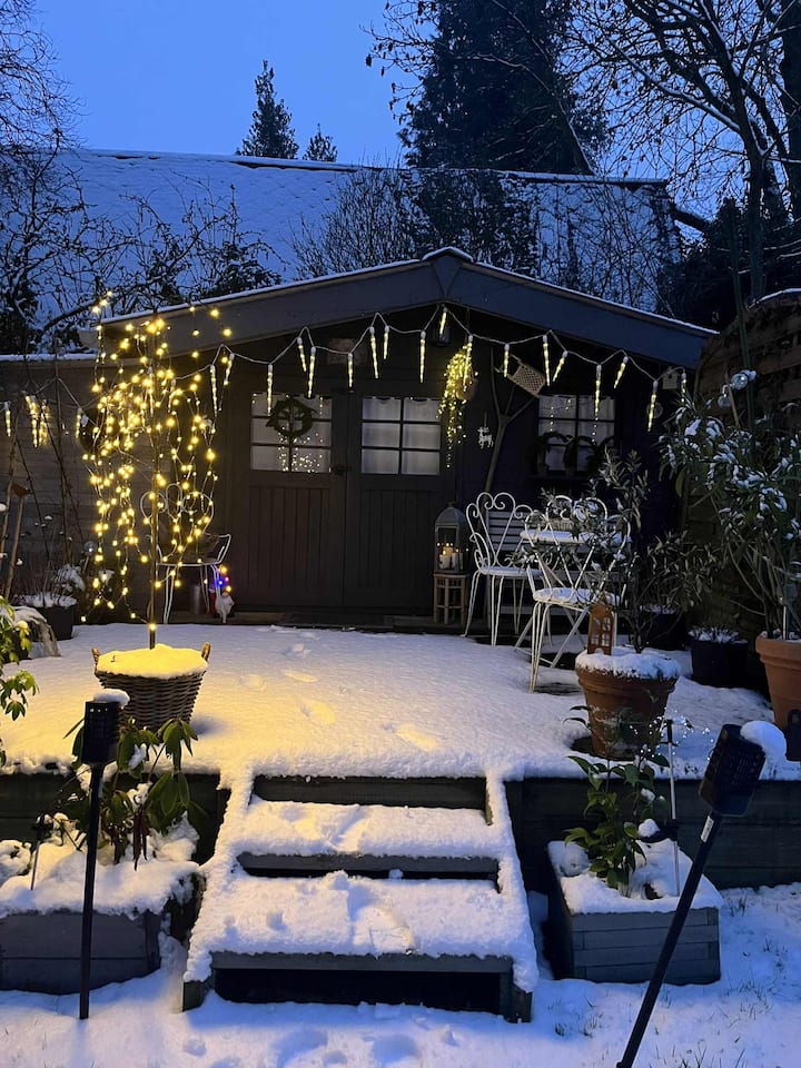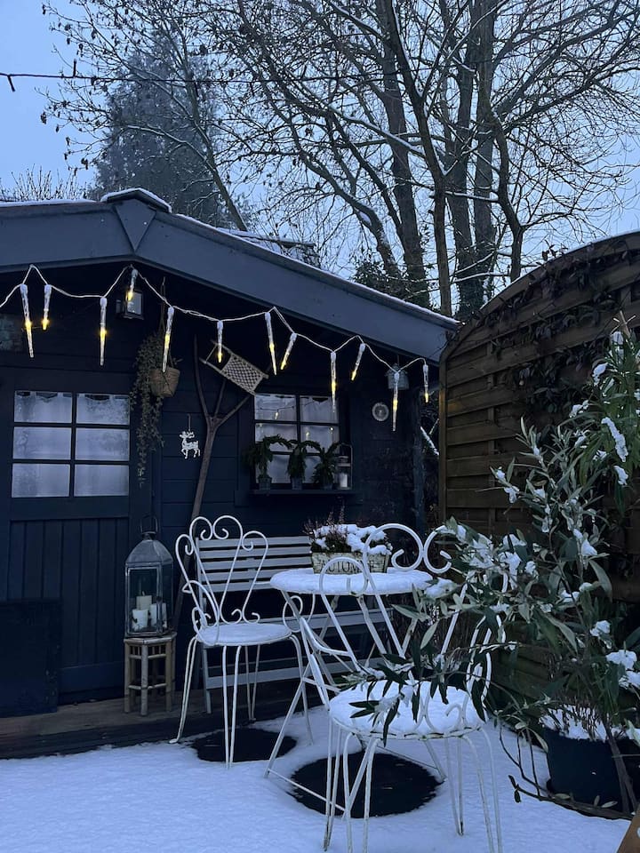 Nyumba ya kwenye mti iliyo nyuma ya bustani