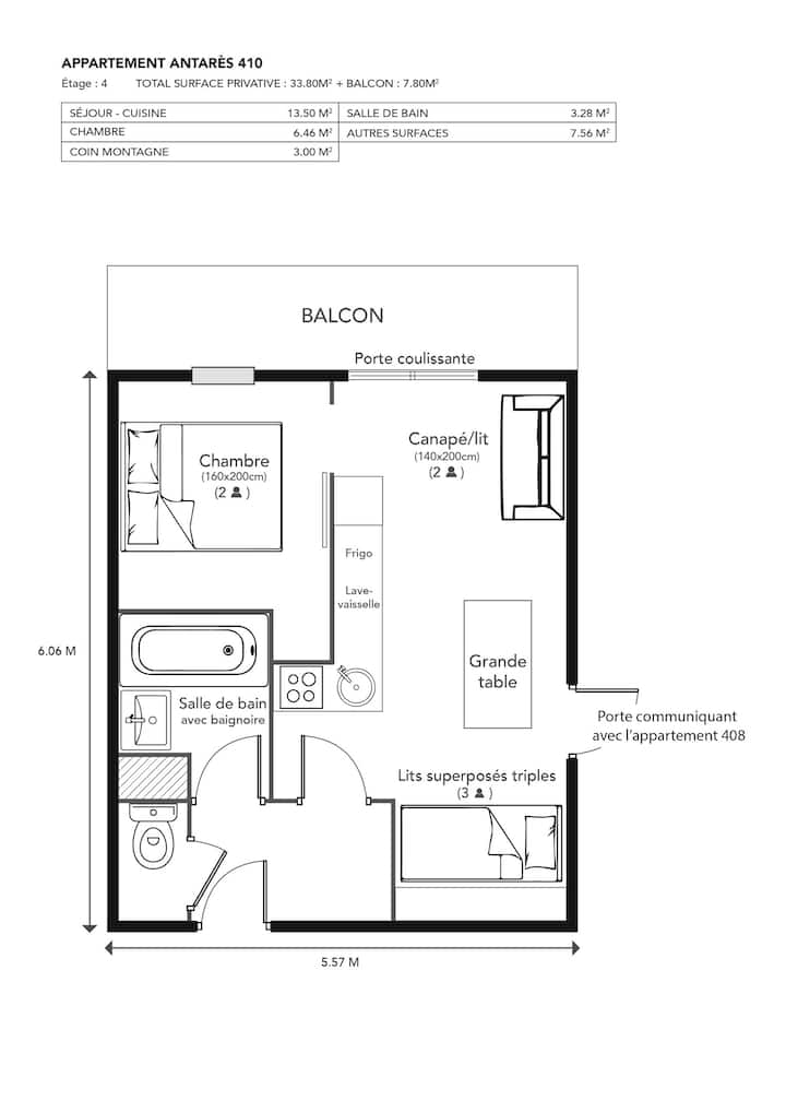 Fleti, iliyo kwenye ghorofa ya 4 ya makazi Antarès, imewekwa kama ifuatavyo :