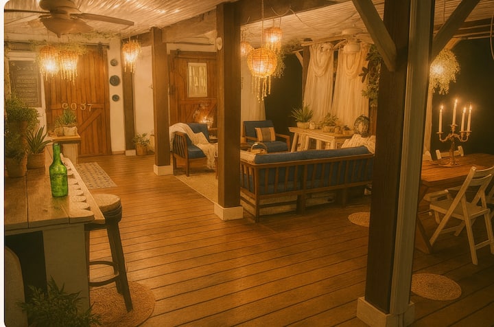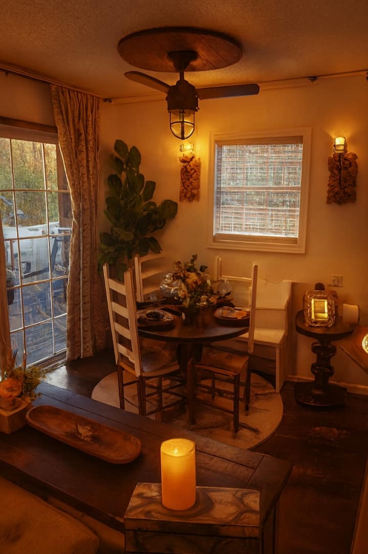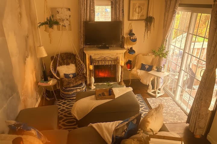 Nyumba iko wazi kwa mahitaji yako na unataka. Vyumba 2 vya kulala. 1 na kitanda cha ukubwa wa malkia na chumba cha kulala cha 2 kina vitanda vya ghorofa vya ukubwa kamili na kochi ambalo hubadilika kuwa sehemu ya ziada ya kulala. Televisheni ina fimbo ya roku na Wi-Fi iliyotolewa. Kuna kamera ya pete. Nyumba ina staha ya juu ina sehemu ya kukaa na kula nje na pete ya moto na jiko la mkaa. Mbao hutolewa kwa ajili yako kwa $ 15 kwa kifurushi. Haturuhusu kuni za nje ziletwe. Sitaha ya ghorofa ya chini ina bafu la nje ambalo linashirikiwa na mgeni wa gari la malazi la zamani la bohemia. Ikiwa ungependa kutumia eneo la burudani la ghorofa ya chini kuna ada ya ziada kwa faragha kamili. Hafla zinaruhusiwa hata hivyo kuna bei ya kila mtu (kulingana na tukio). Wanyama vipenzi wana ada kwa kila mnyama kipenzi kwa kila ukaaji kwa ajili ya kufanya usafi. Tunashirikiana na jasura za nje za Carolina kwa ajili ya ziara ya kayak inayoongozwa tuombe msimbo wa punguzo. Pia tunashirikiana na shamba la AA la bluu na tunatoa kuponi.