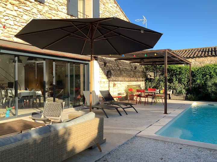 Sehemu kubwa ya kuishi inafunguka moja kwa moja kwenye bwawa na bustani ya cocooning iliyo na asali na laurels.
